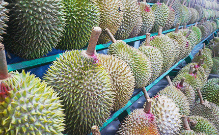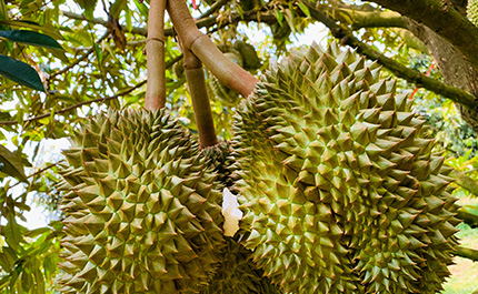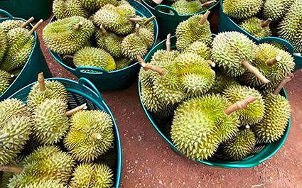 カンヤオドリアンの果実はやや平たい形をしており、果皮は赤みがかっています。果肉の質感は柔らかく、甘さが濃厚でも飽きず、ほんのり酸っぱさの中にミルクの香りがほのかに漂っています。